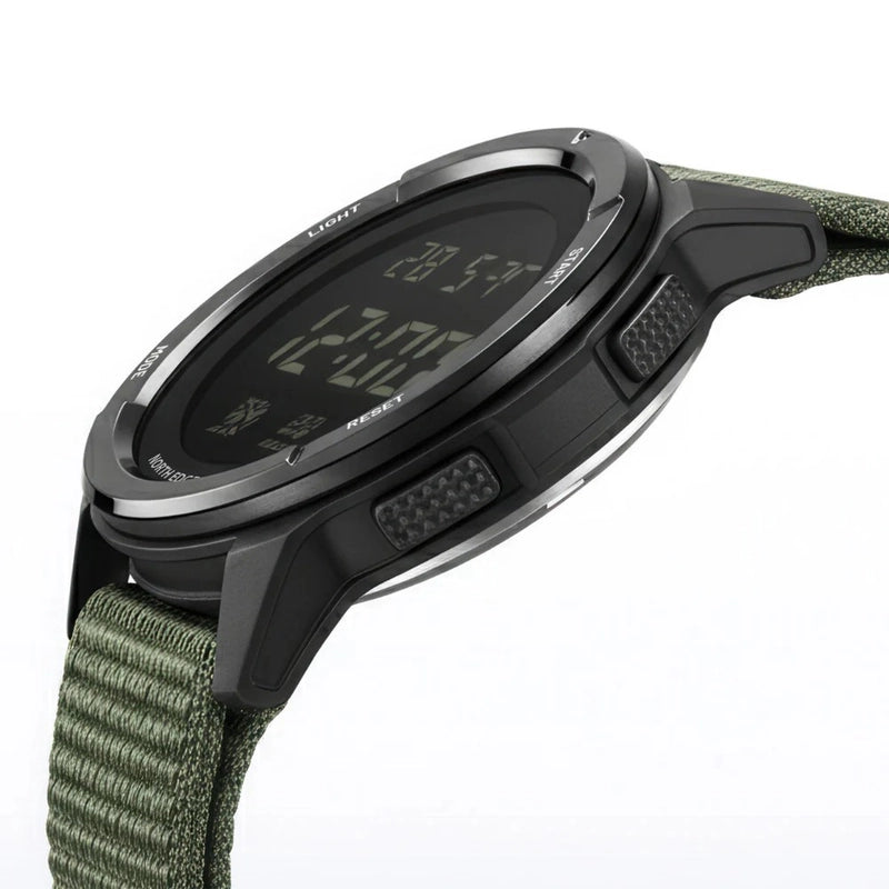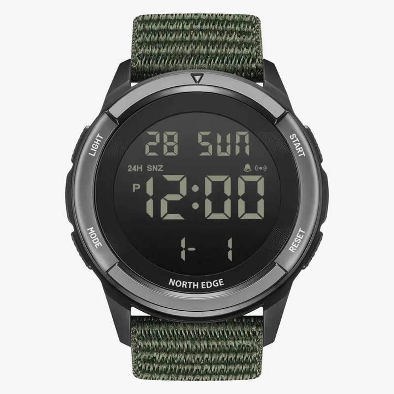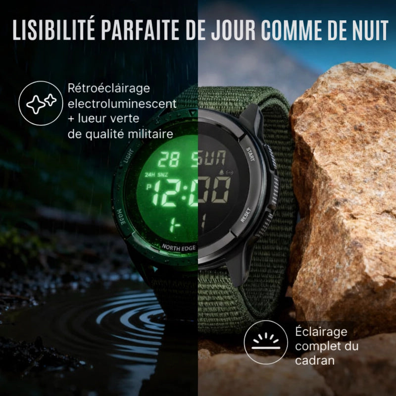 Le système d’illumination à double mode combine un rétroéclairage complet du cadran et un affichage vert à fort contraste. L’heure et les informations essentielles restent lisibles de jour comme de nuit, en extérieur comme en faible luminosité, sans effort et sans réglage complexe.