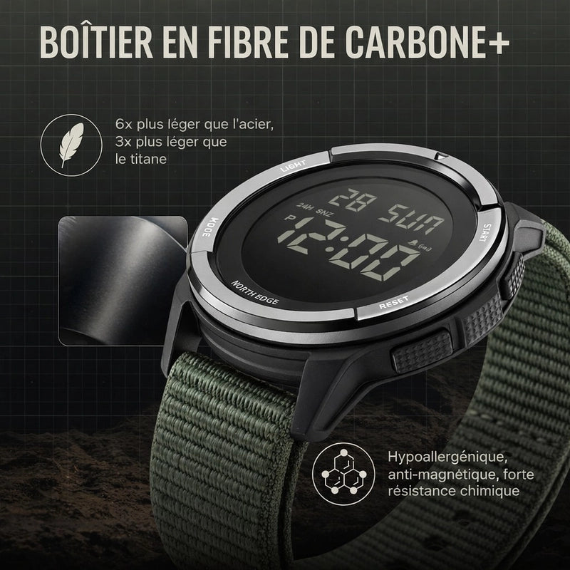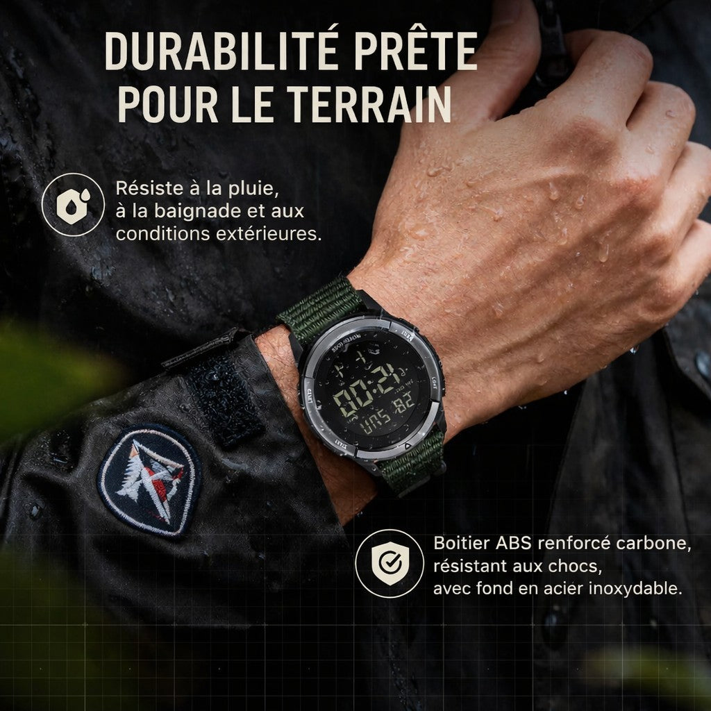 Le boîtier en ABS renforcé carbone, associé à un fond en acier inoxydable, protège la montre contre les chocs, la pluie et l’exposition prolongée en extérieur. Elle supporte sans difficulté les activités quotidiennes comme les usages plus exigeants, y compris la baignade.